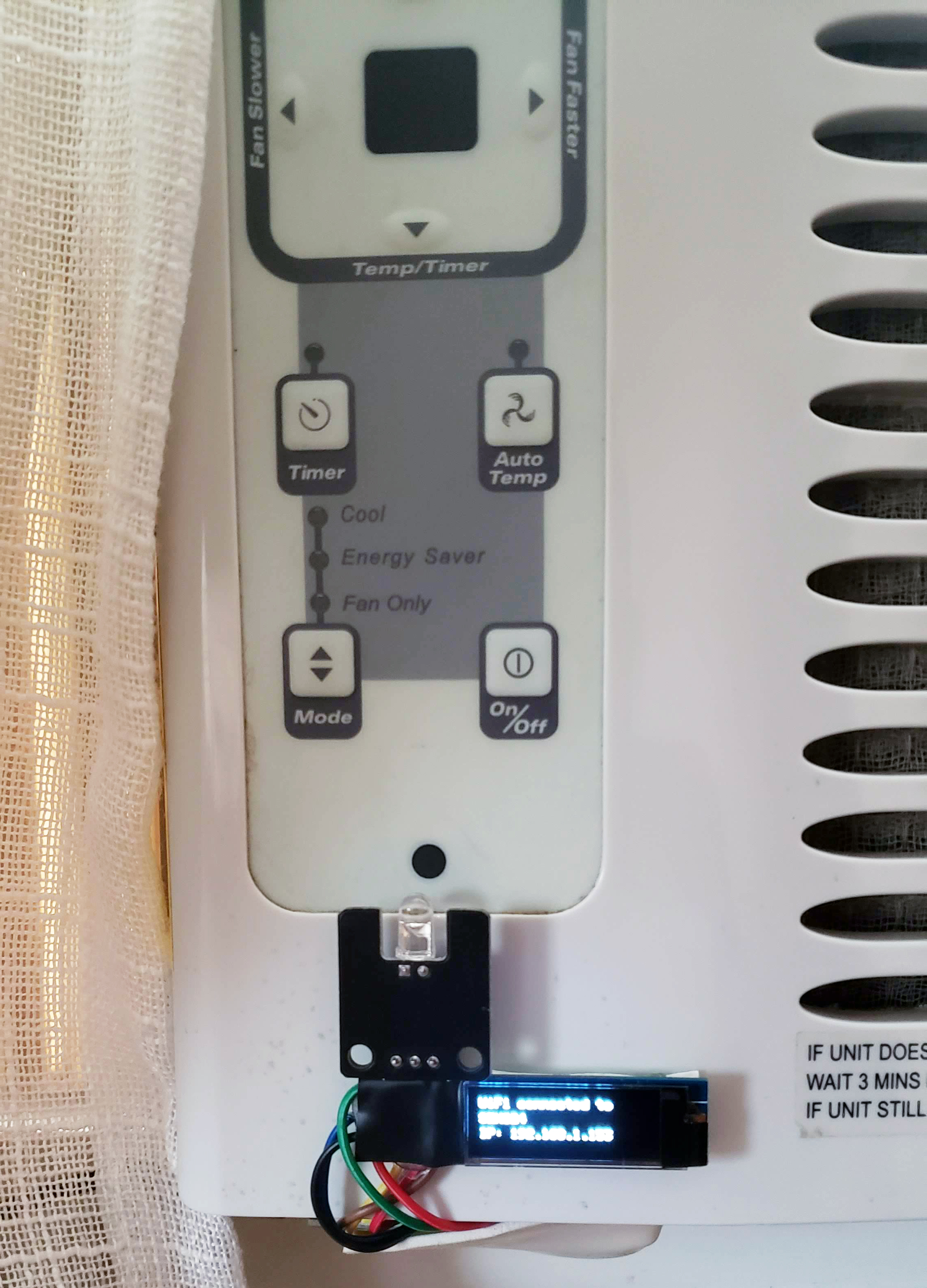 8) Assemble your smart remote, flash sketch, attach to AC/TV/gadget by mounting scotch tape and you should be allset. By the way, don't forget to configure WiFi connection finally. You should get something like this (it's my smart remote attached to my old Frigidaire air conditioner